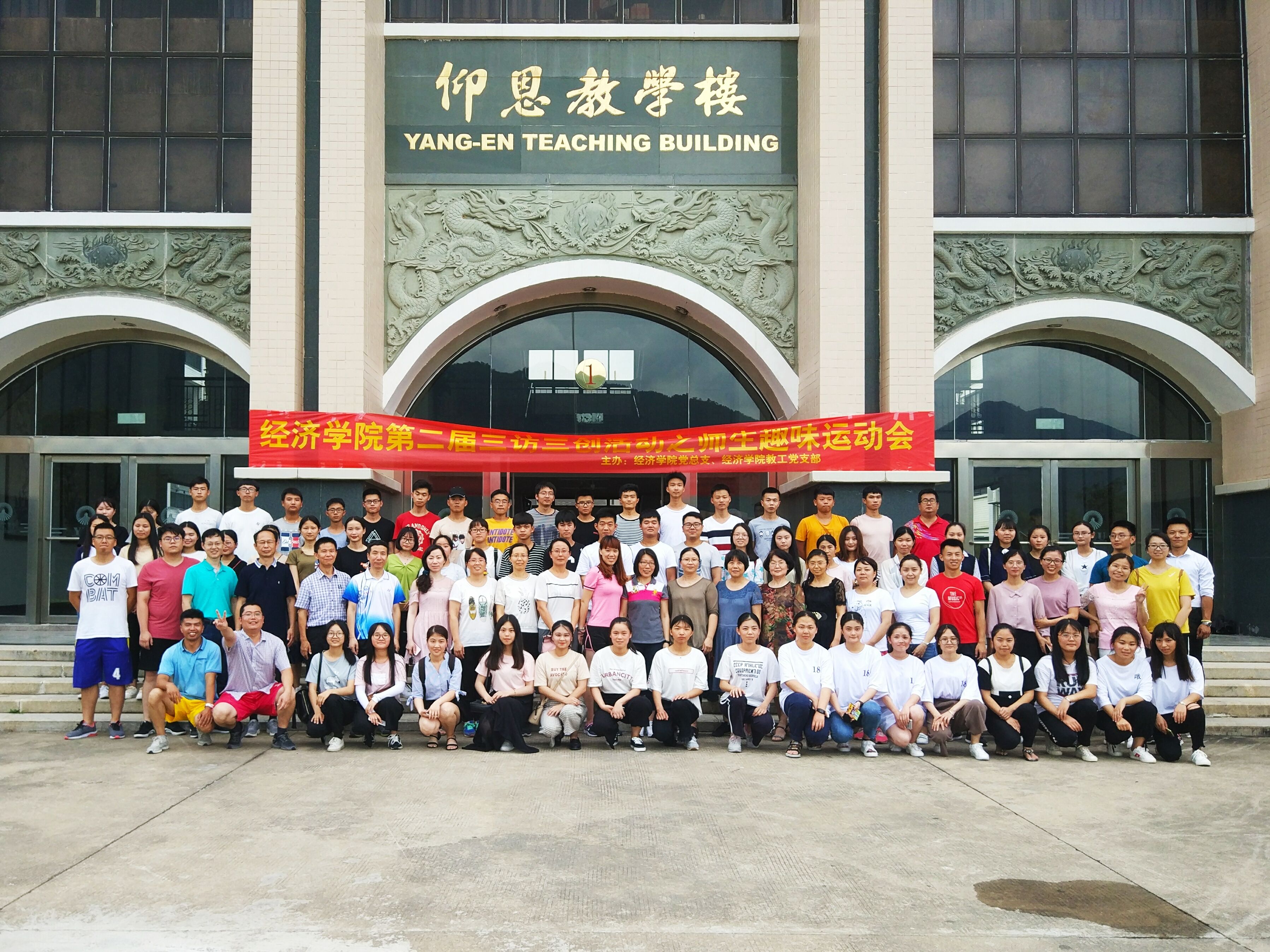 尽管烈日炎炎,现场人头攒动情绪高涨,各支队伍皆跃跃欲试,充分做足热身准备,争分夺秒练习比赛项目。在50米迎面接力赛中,选手们紧握接力棒,似离弦之箭向前冲刺,加油呐喊声此起彼伏,接力棒的交接牵引着全体观众的心。比赛过程中出现掉棒失误选手,其余队员不甘示弱,奋起直追。经过两个回合排名比赛,最终由用时最短的经济系取得项目第一。五人六足、趣味接力赛、穿越呼啦圈项目则考验师生协作默契。赛前,参赛选手摩拳擦掌,寻找加快速度、保持平衡的方法。比赛现场热烈激昂,加油声如潮水般一浪高过一浪,各支队伍精神抖擞,紧密配合,团结协作,奋勇争先。经过激烈的比赛后,师生欢声笑语其乐融融,于仰恩楼正门合照留念。