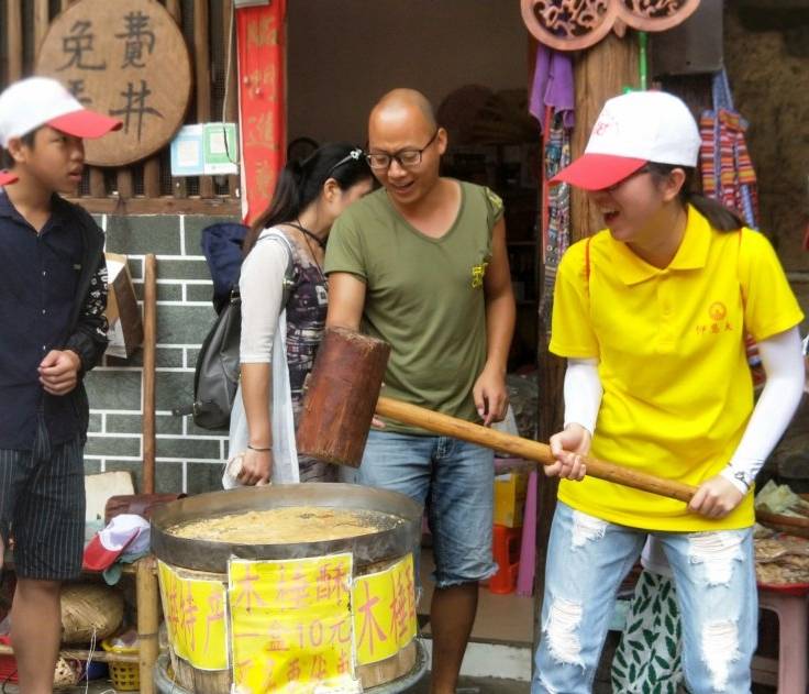 随后,实践队来到了裕昌楼,据悉裕昌楼被称为“福建土楼之母”,实践队观察到外墙虽遍体龟裂,看上去像一个满脸皱纹的老人,但实则墙体坚固,历经无数次风雨、地震的考验,依然如故。沿途实践队还发现当地著名的糕点木棰酥,在当地群众的引导下,实践队纷纷动手体验了一把捶木锤酥的体验。
