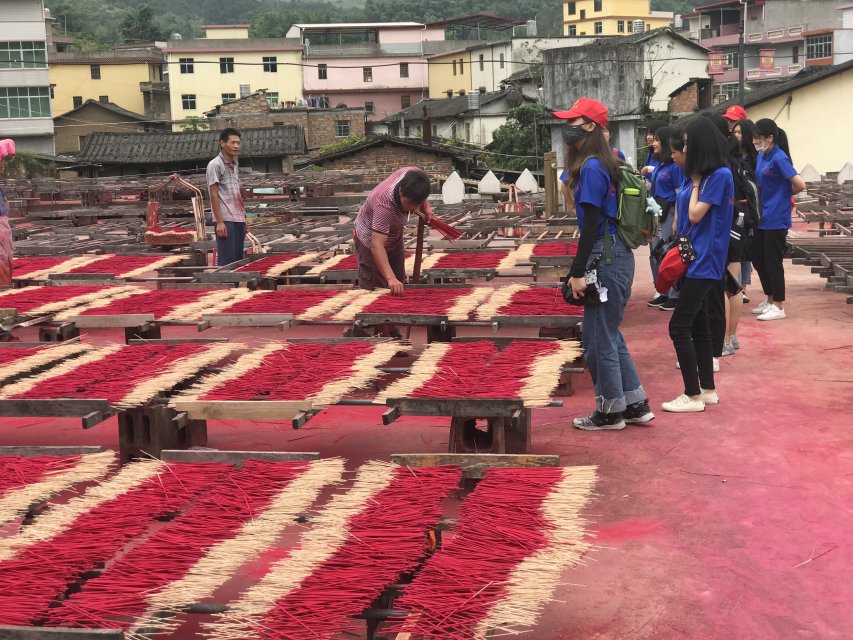 通过村委会负责人详细的介绍,实践队员们对汉口村香产业的产品销售情况有了较为全面的了解。目前,汉口村每年生产的香产品除了销往国内各大城市,还远销泰国、印度尼西亚等东南亚国家。此外,实践队员们参观了汉口香厂——一家具有三十多年历史的老制香厂。在香厂负责人的介绍下,实践队员们了解制作永春篾香的工艺和具体步骤。制作永春篾香分为制签、裹粉、晒香、染色、包装五个环节。实践队员们走上街头,采访香产品个体销售户,了解近几年汉口村香产品的销售状况,并详细记录。实践队员们还与福州大学生物工程学院科普服务实践队因香结缘,共同探索汉口村发展的历程,讨论乡村振兴与发展的实践经验。