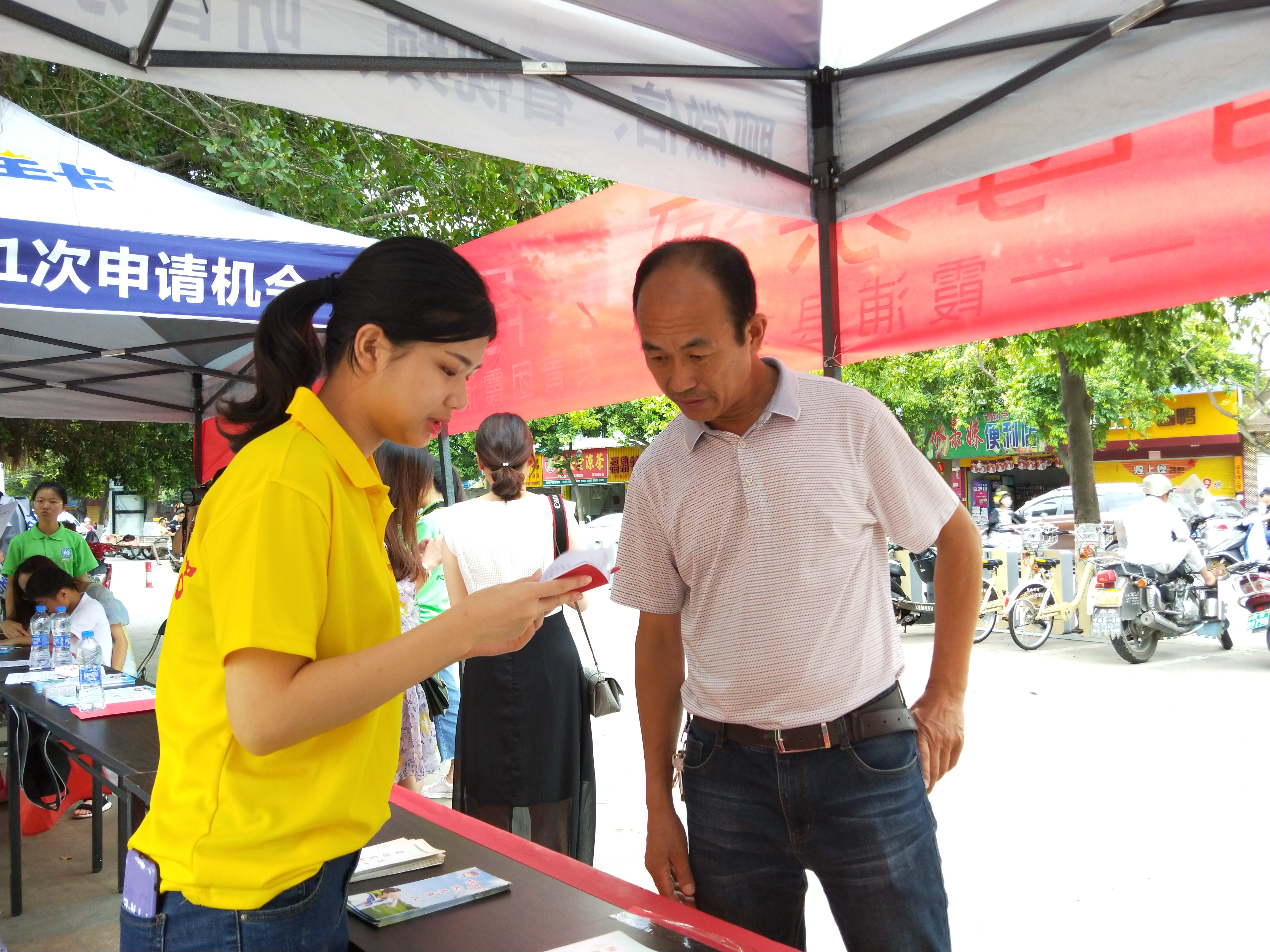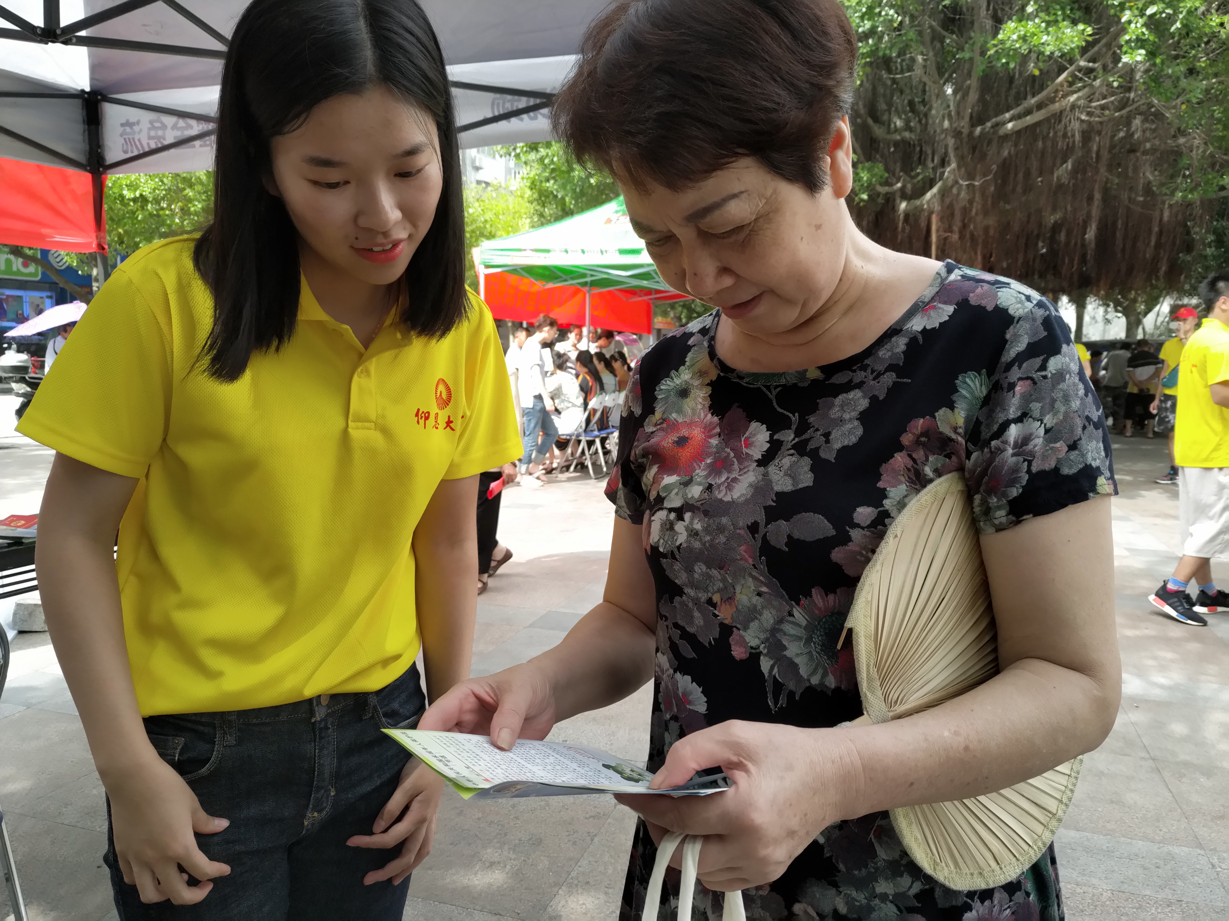 在文化广场上设立服务站分发宣传册和禁毒宣传的纪念品。实践队伍分为两个部分,8名实践队员到街上分发宣传册,另外8名队员在站点进行讲解禁毒内容和分发纪念品。在领取禁毒纪念品前,需要领取人扫码关注共青团霞浦县委员会,了解更多禁毒知识,让霞浦人民参与到禁毒工作。与此同时,共青团县委也安排了宁德师范学院绿色环保何禹暑期实践队在此地宣传保护水资源。在此期间,两支队伍进行了禁毒知识与保护水资源的内容交流以及分享实践的经验,并互相鼓励,合影留恋。