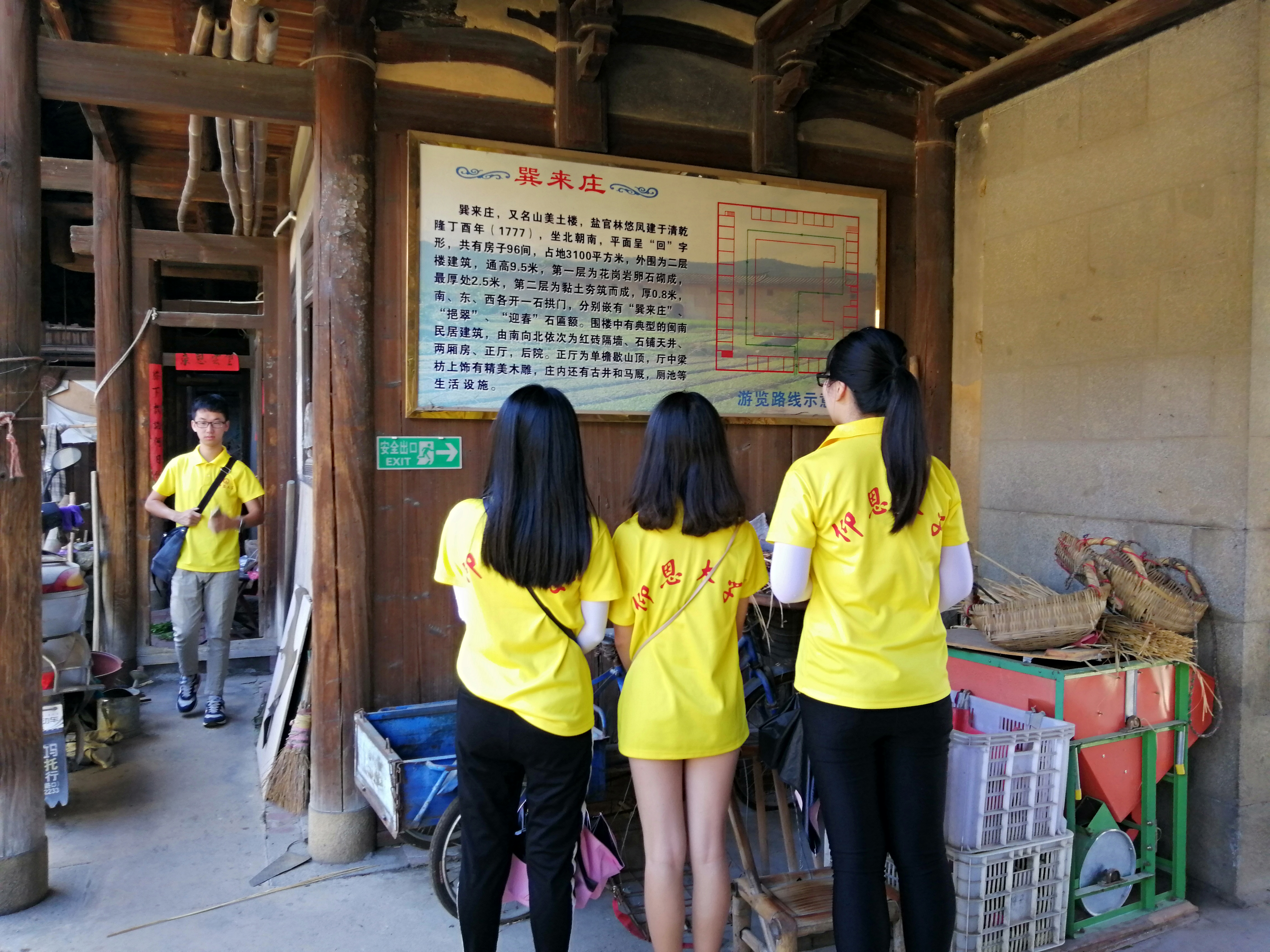 实践期间,实践队员对土楼开展调查。土楼至今保存基本完好,在大门处,嵌一块石牌匾,上面写着“巽来庄”,两侧还刻有“乾隆丁酉”、“三秋吉立”由此看出土楼历史悠久、年代久远。实践队员触摸土楼斑驳的外墙,感受到旧时匠人的巧夺天工,将朴实的泥土构筑成迷人的风景。
