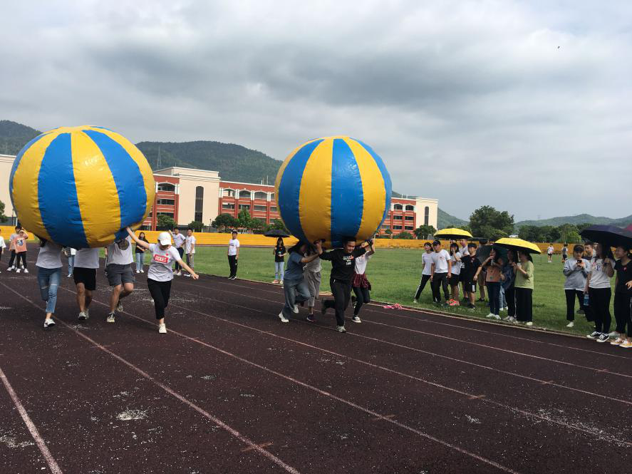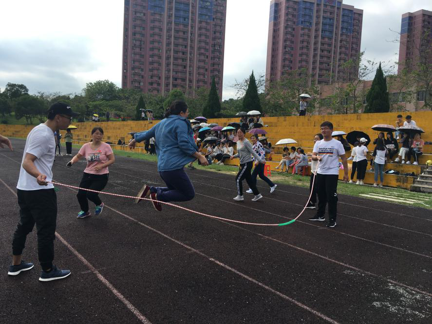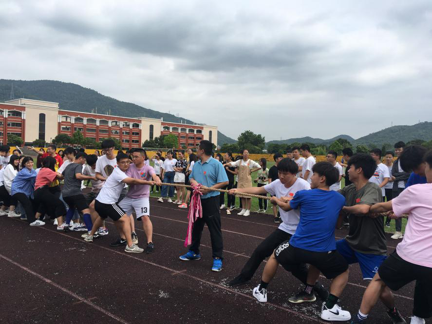 (图为拔河) 活动开始由陈建鑫老师带领全体师生做健身操热身,在欢快灵动的音乐下,师生们活动手脚舒展身体,现场气氛立刻活跃起来。接着是拔河比赛,一共四支师生队伍,通过激烈的角逐出队伍排名,鼓舞声欢呼声响彻操场。随后的托气球比赛则需要四个人齐心协力将气球托举到终点再返回,各系都斗志昂扬,场面十分欢乐。跳绳比赛和足球比赛同时进行,三支跳绳队伍井然有序,争取在有限的时间内跳出好成绩。而在足球场上,师生们挥洒汗水,努力为本队伍赢得胜利。