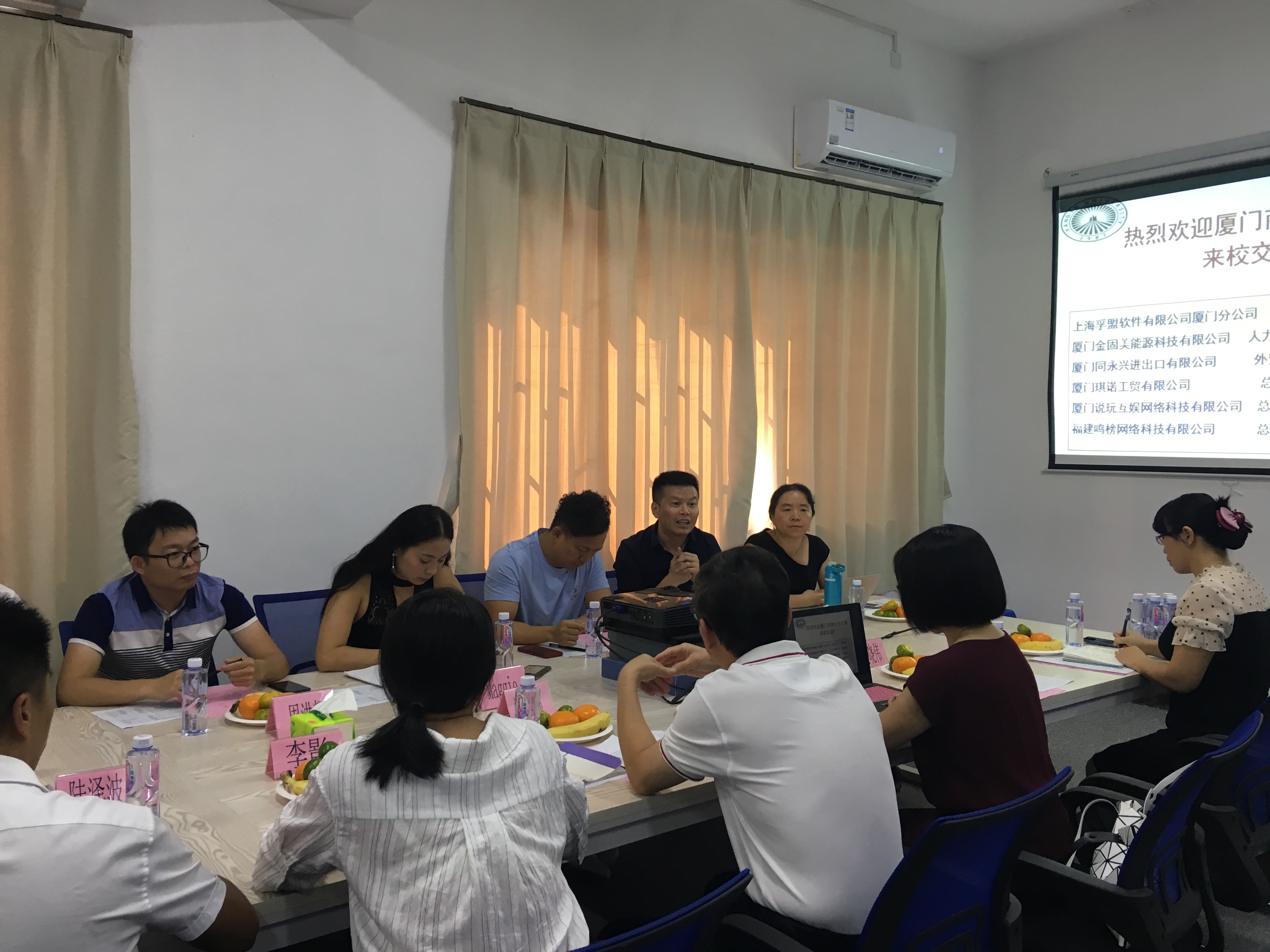 2019年9月24日,betway西汉姆联官网牵头举办厦门商圈深化校企合作对接交流会。教务部主任郑兆领及betway西汉姆联官网、工程技术学院相关人员与上海孚盟软件有限公司厦门分公司总经理邱河川、厦门琪诺工贸有限公司总经理陈鲤宁、厦门金固美能源科技有限公司人力资源总监周洪辉、厦门同永兴进出口有限公司外贸部总监Maggie、厦门说玩互娱网络科技有限公司总经理苏炳灵、福建鸣榜网络科技有限公司总经理高钊颖等一行十人企业代表进行座谈,校企双方就企业创新发展中的人才需求与高校应用型转型对实践教学资源的需求等问题进行共同探讨。