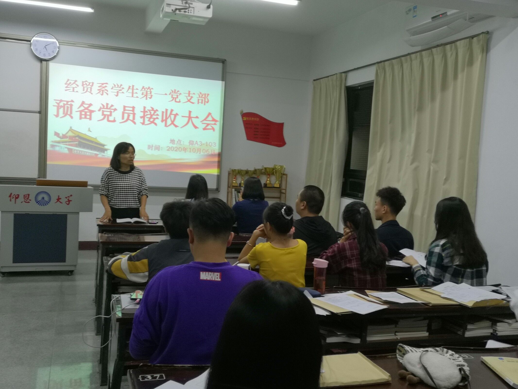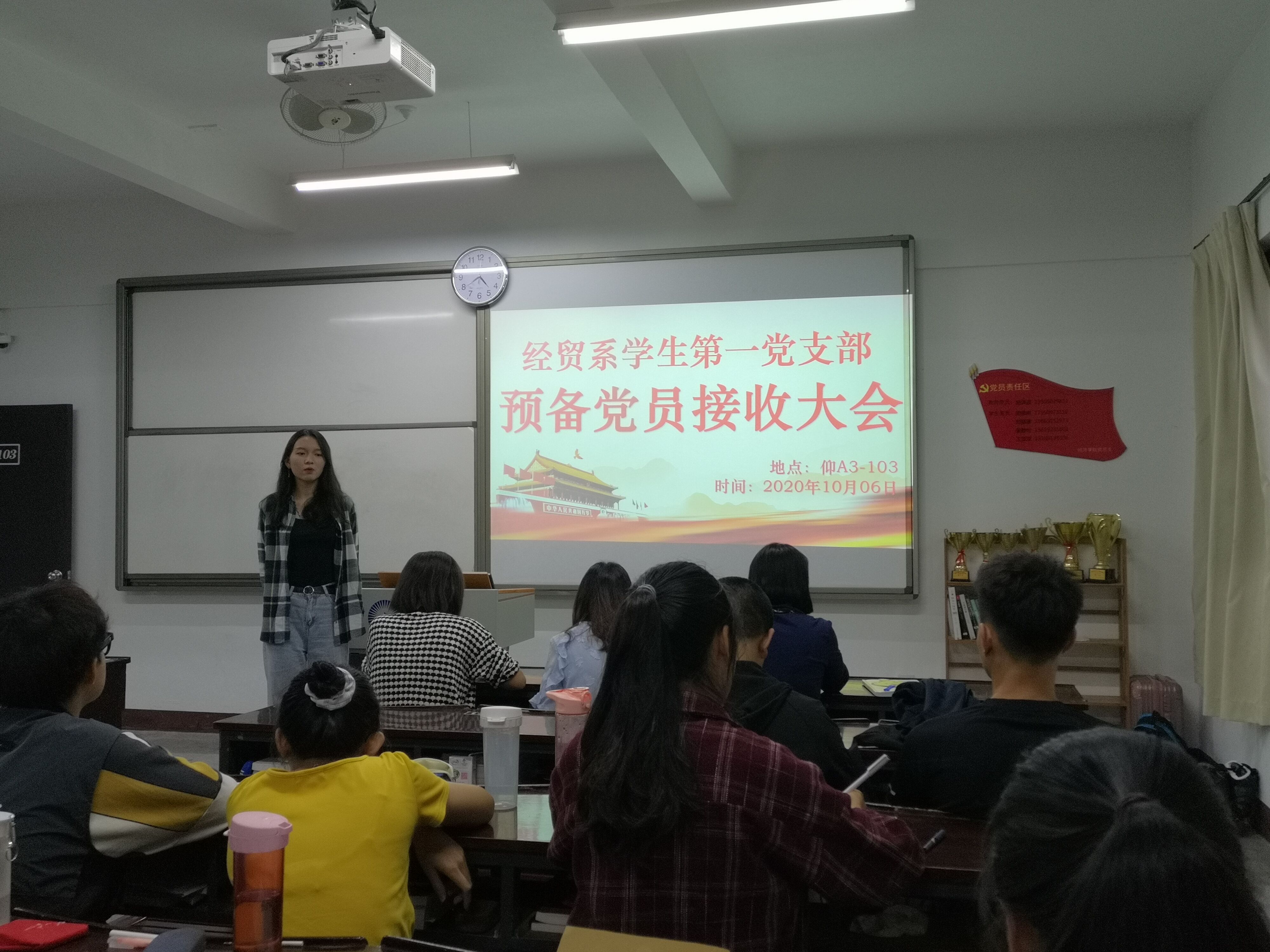 为响应党的号召,吸收优秀同学,betway西汉姆联官网经贸系学生第一党支部于2020年10月6日在仰恩楼A3-103召开中共预备党员接收大会,本次会议共有10名党员出席,由支部书记林丽华主持。