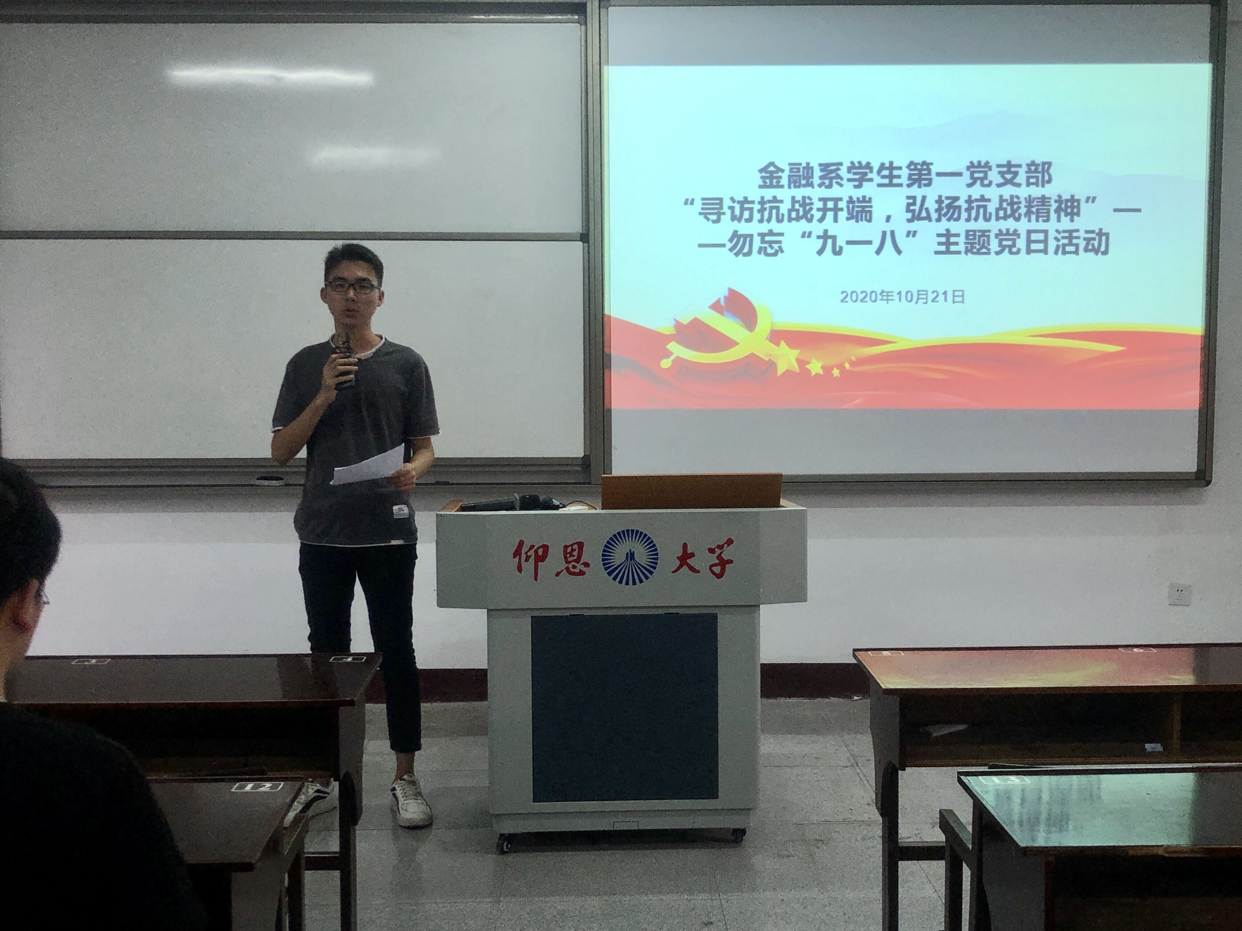 2020年10月21日,betway西汉姆联官网金融系学生第一党支部于仰恩楼D2-401开展“寻访抗战开端,弘扬抗战精神”——勿忘“九一八”主题党日活动。本次活动参会人员有支部组织委员何丽玲、支部全体党员和18级、19级各班积极分子代表。