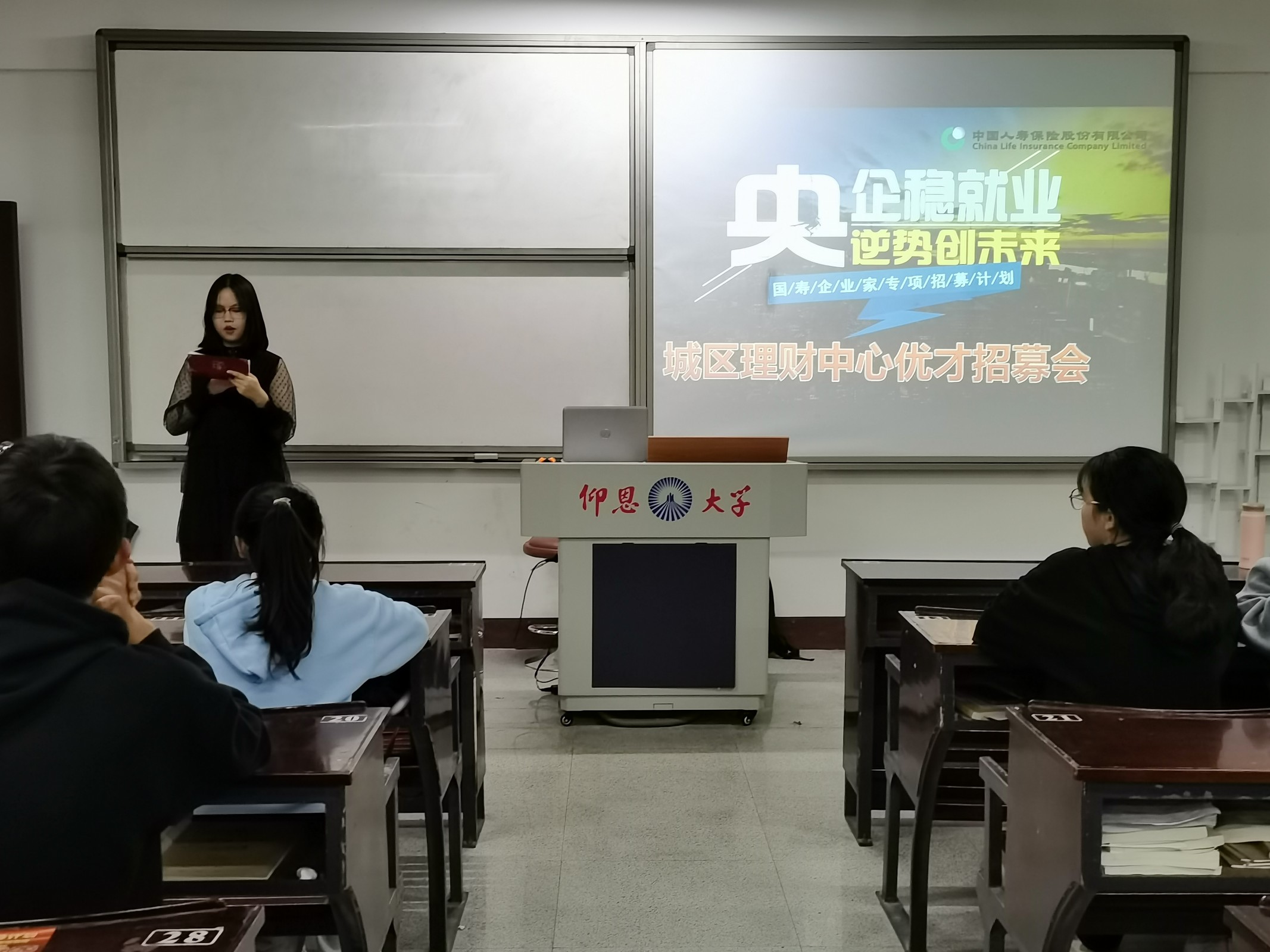 为了更好地拓宽毕业生的就业渠道,缓解高校毕业生的严峻就业形势。由betway西汉姆联官网主办,betway西汉姆联官网职业发展中心协办的中国人寿城区理财中心宣讲会于2021年11月22日下午四点在仰恩楼A2-101成功举办。参加本次宣讲会的有两名中国人寿公司负责人和betway西汉姆联官网学生。