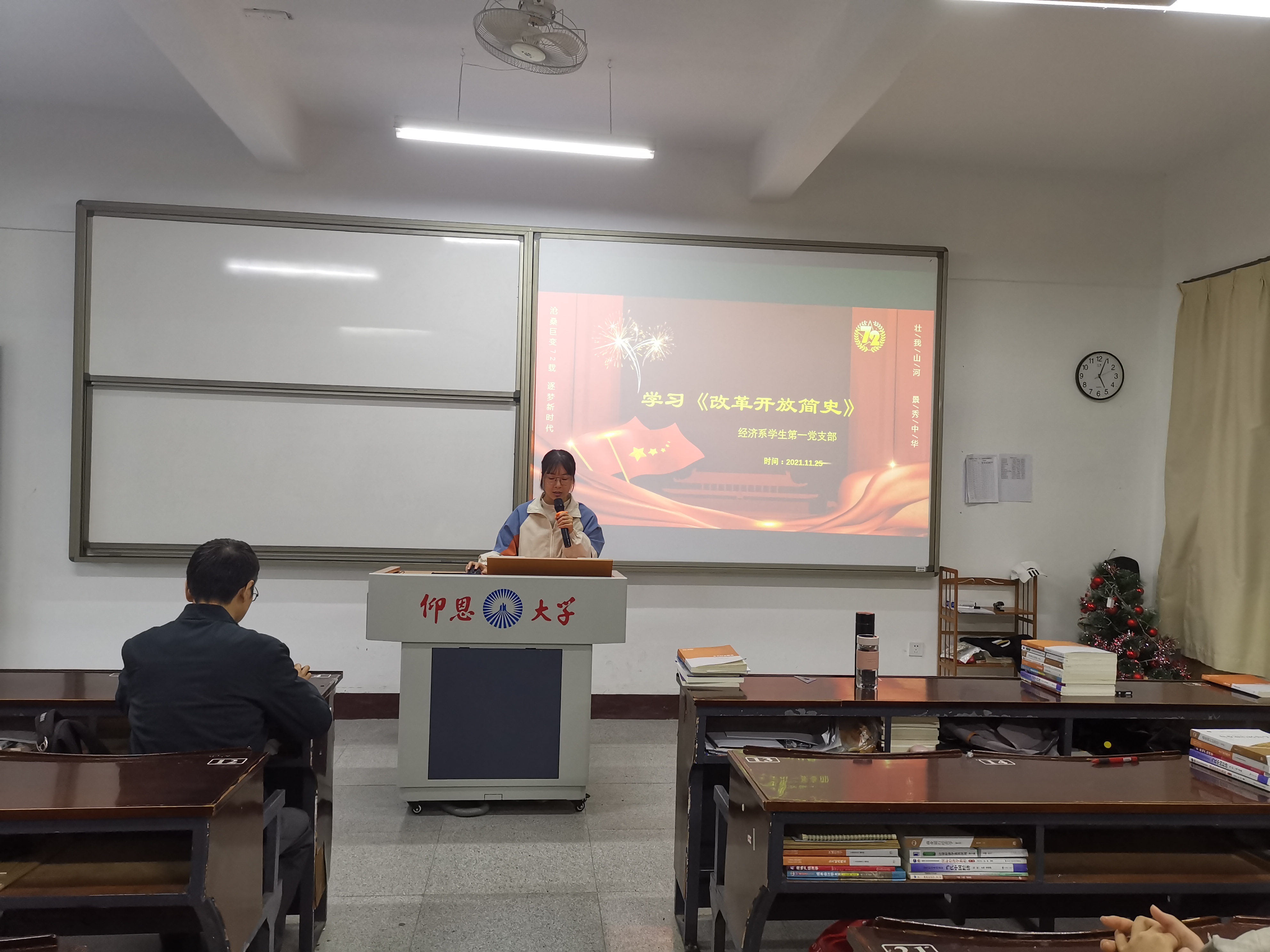 为进一步普及改革开放为我们带来的深刻影响,2021年11月25日下午,betway西汉姆联官网经济系学生第一党支部于仰恩楼B3-205开展“学习《改革开放简史》”的学习交流会。主讲人为张昭霖干事,参会人员为经济系学生第一党支部副书记姚姝然老师、组织委员仲平老师以及支部全体学生党员。