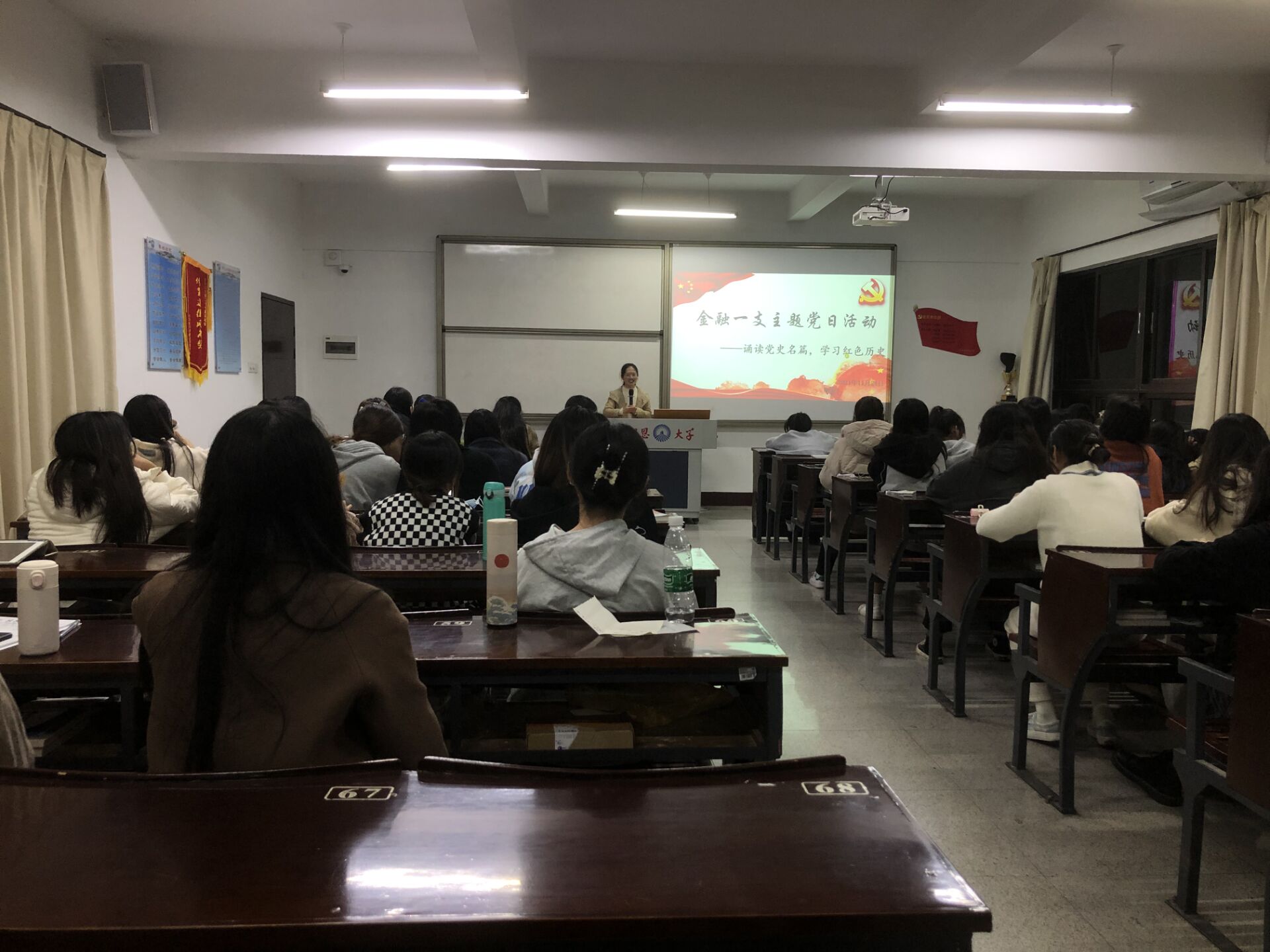 图1 何丽玲老师给同学们上党课 党课开始,何丽玲老师用自己扎实的理论功底,结合生动的事例,对党的十九届六中全会精神作出讲解,最后勉励同学们要学好党史这门“必修课”,坚持系统学、深入思考学、联系实际学,永葆党员的先进性和纯洁性。