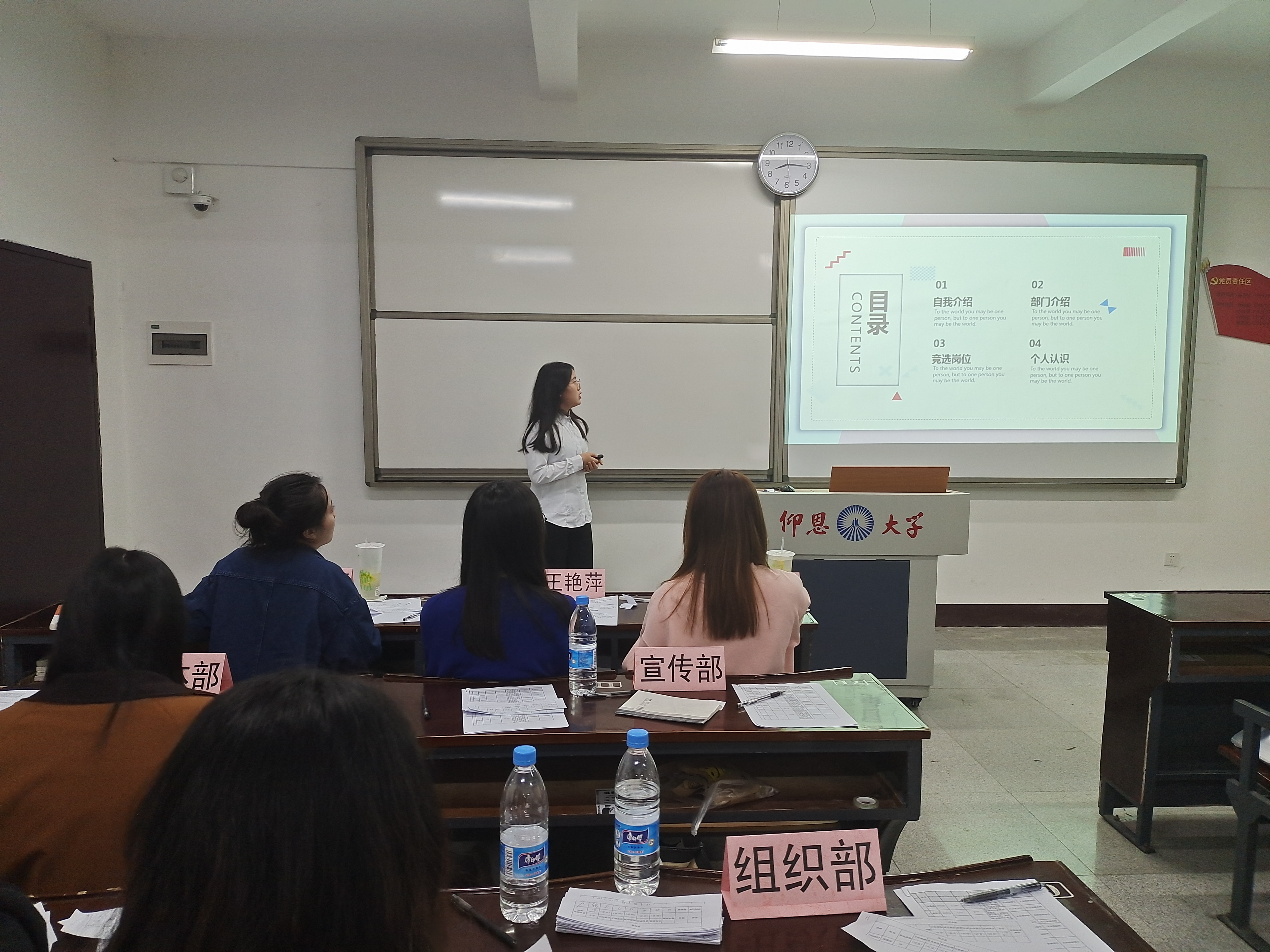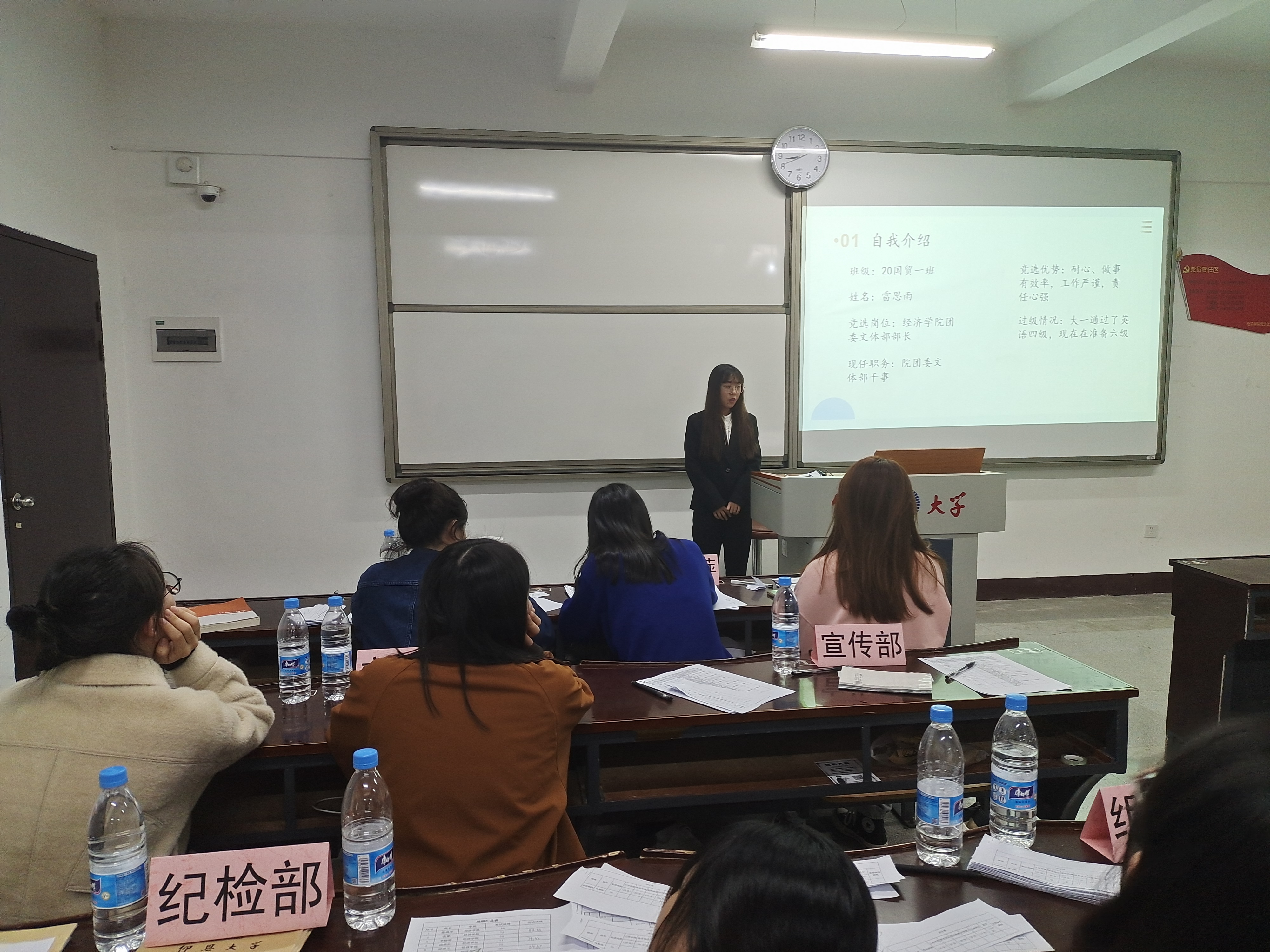 图1 竞选者在进行PPT展示 在这次换届面试上,首先是竞选者从自身优点、对团委及自己所竞选的位置的认识及对自己留任部门未来的规划三个方面进行PPT展示,接着是以抽签的方式进行半结构化问题回答,竞选者们都向大家展示了自己灵活的应变能力与表达能力,最后是各评委们针对候选人的表现与展示提出问题。自信源于承担,成功来自责任,竞选者们有志向,能力强,体现出经院学子沉着冷静、有条不絮的精神面貌。