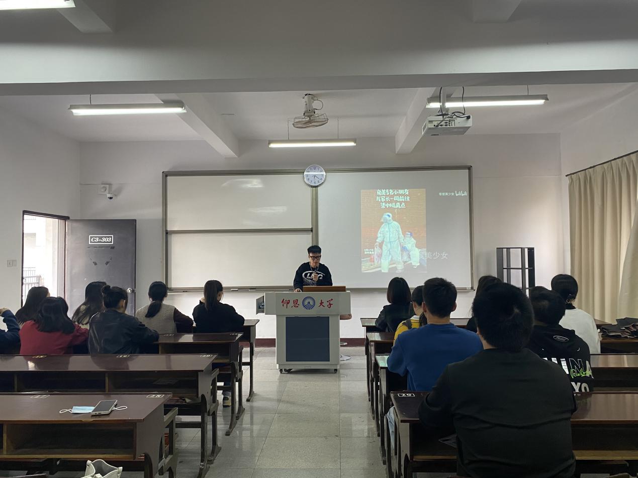 图1 宣传委员王梓谦介绍防疫相关材料 活动开始,由支部宣传委员王梓谦带领大家学习新时代雷锋精神的内涵、抗疫的英雄人物事迹等防疫相关材料,其内容丰富、脉络分明、语言生动、见解深刻,具有很强的指导意义。