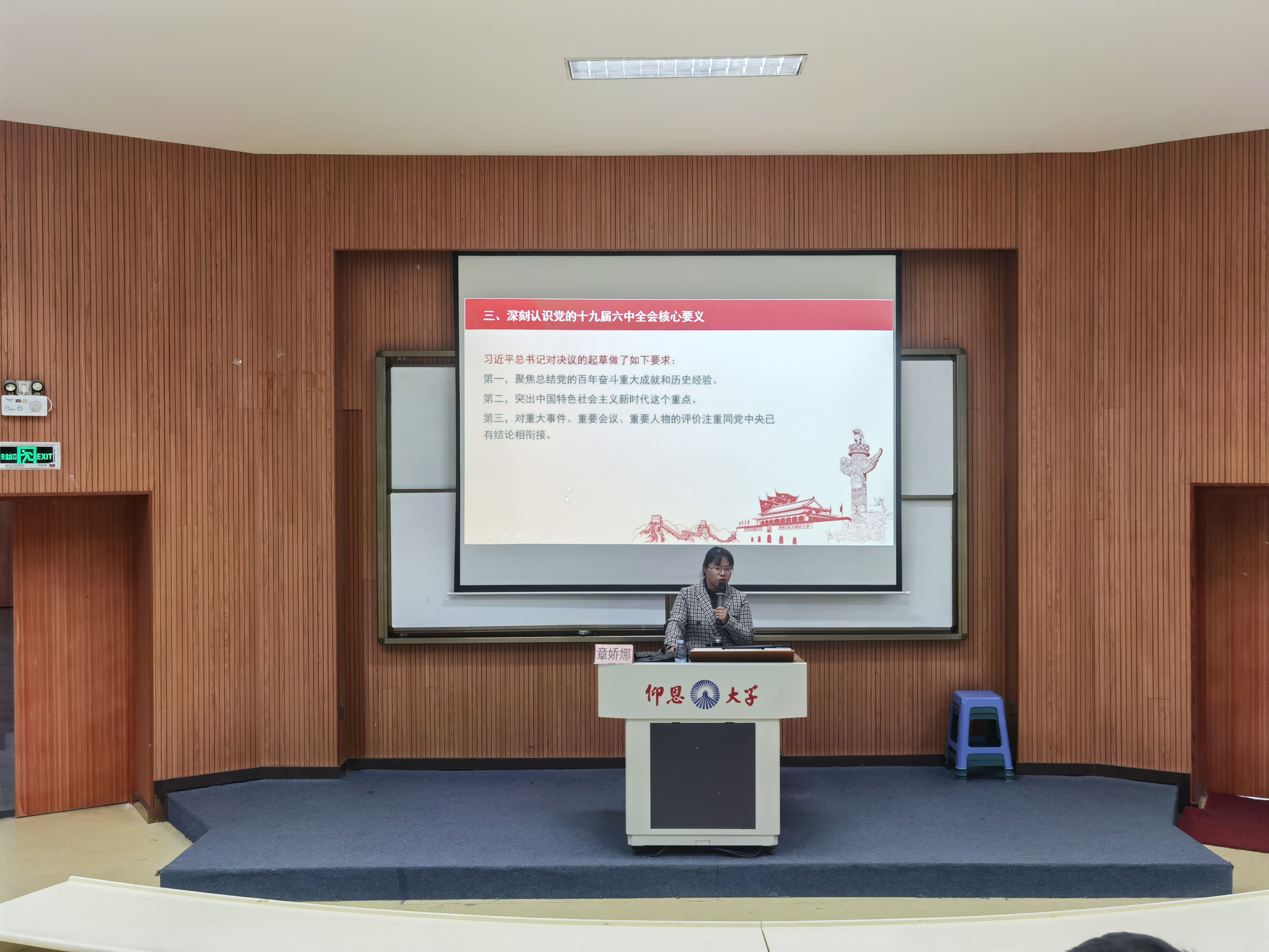 图1 章娇娜副教授宣讲中 宣讲会上,章娇娜从三个“深刻认识”出发,聚焦总结党的百年奋斗重大成就和历史经验,重点阐述了党的十九届六中全会的重大意义、五大丰碑重要成果及核心要义。章娇娜通过层层剖析,指出党的十九届六中全会是在我党成立一百周年的重要历史关头召开的一次具有重大历史意义的会议,我们要从党的百年奋斗历程的历史意义和历史经验的总结中,深刻意识到新时代下我党的新征程的新要求,明确我党的未来理论和实践指引、目标指引和精神感召,由此,深入领会“两个确立”的重要意义,深入领会“中国共产党是什么、要干什么这个根本问题”。
