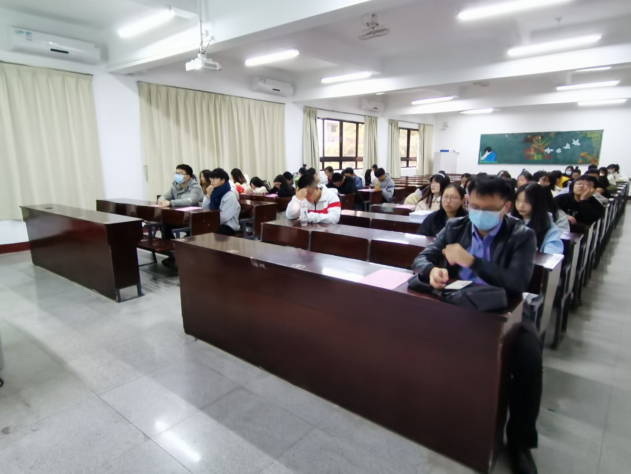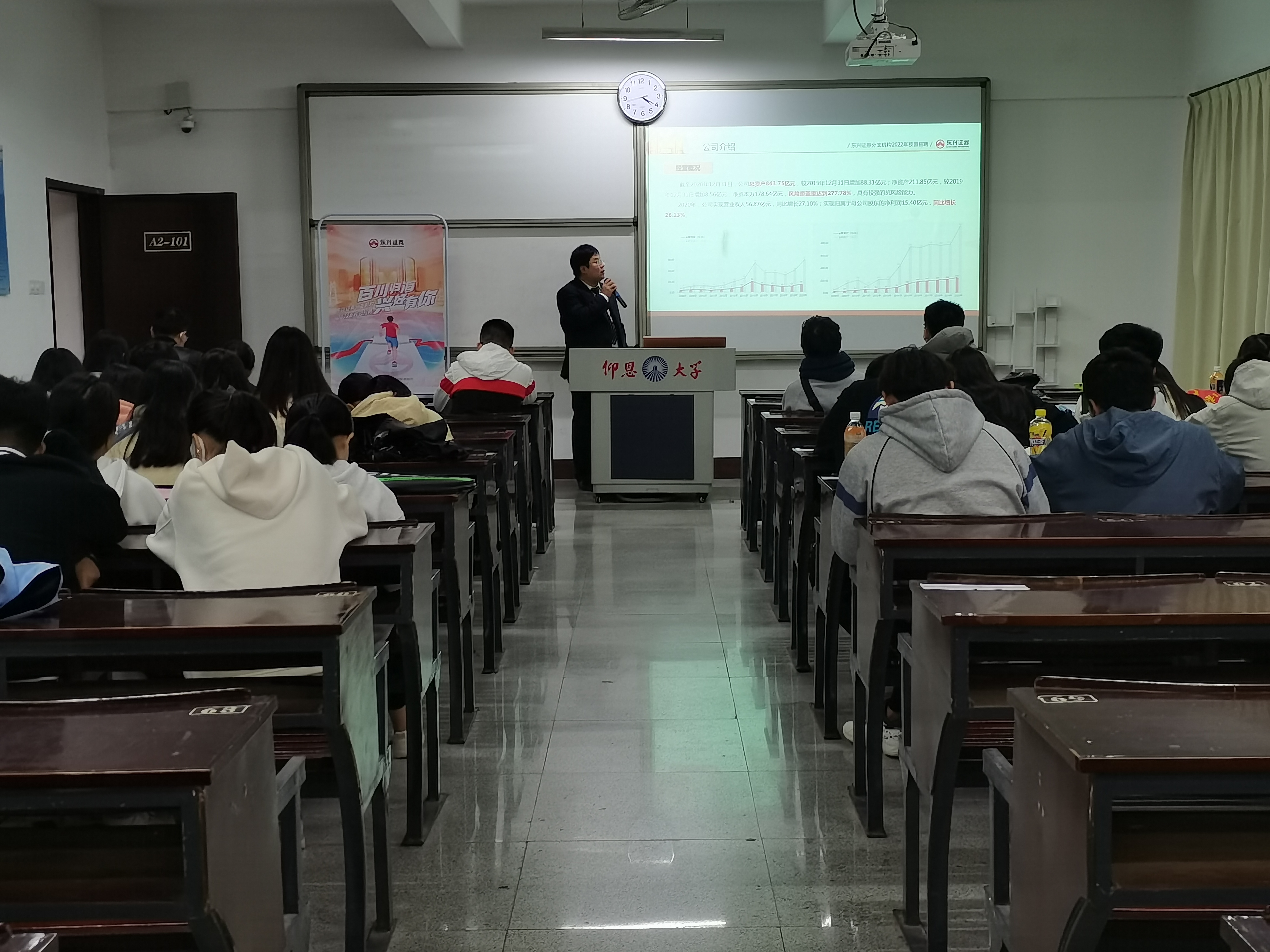 图1 讲师正在讲解 本次宣讲会中,讲师何洪慰为同学们介绍了该企业网申、笔试、面试、实习考察、录用等系列招聘流程,帮助同学们更好地根据自身情况,参照招聘流程提前做好个人规划,以便更好的应对应聘。此外,讲师何洪慰就公司经营情况、公司股东、公司主要荣誉、公司业务、公司岗位及职责进一步展开了详细介绍。最后,东兴证券两位负责人与同学们积极展开讨论,为同学们答疑解惑。