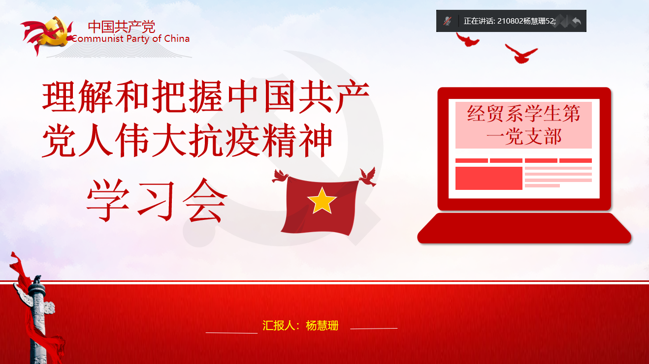 为强化支部同志对中国共产党人伟大抗疫精神的认识与理解,引导支部同志学习树立伟大中国精神,响应在全社会大力弘扬伟大抗疫精神号召。2022年4月27日下午两点,经贸系学生第一党支部在线上召开了“理解和把握中国共产党人伟大抗疫精神”主题学习会。本次到会有经贸系学生第一党支部书记黄培真老师、支部全体学生党员、入党积极分子。主讲人为杨慧珊同学。