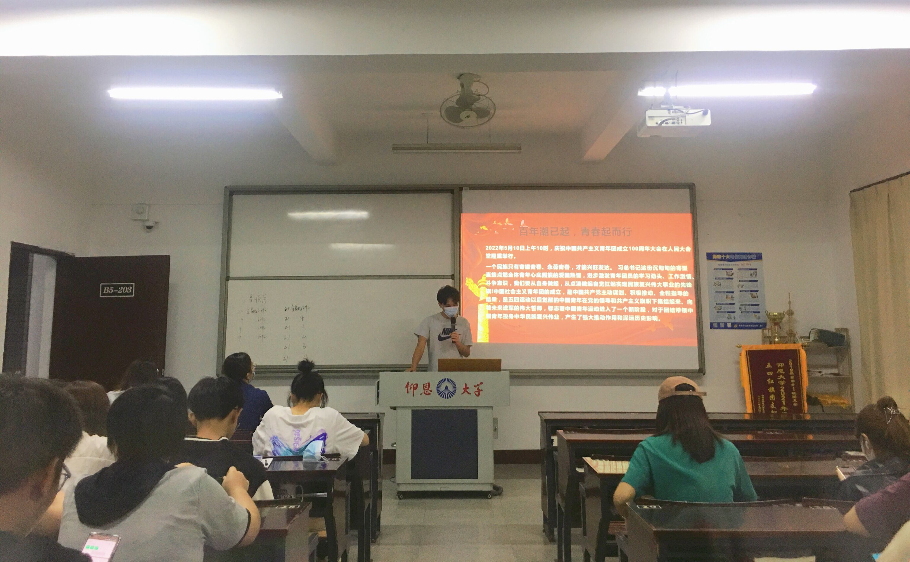 2022年5月19日晚上19:30,金融系学生第一党支部在仰恩楼B5-203开展关于“习近平总书记在庆祝中国共产主义青年团成立100周年重要讲话精神”学习会,此次学习会参与人员有支部书记何丽玲老师、金融一支全体党员以及各班积极分子代表。