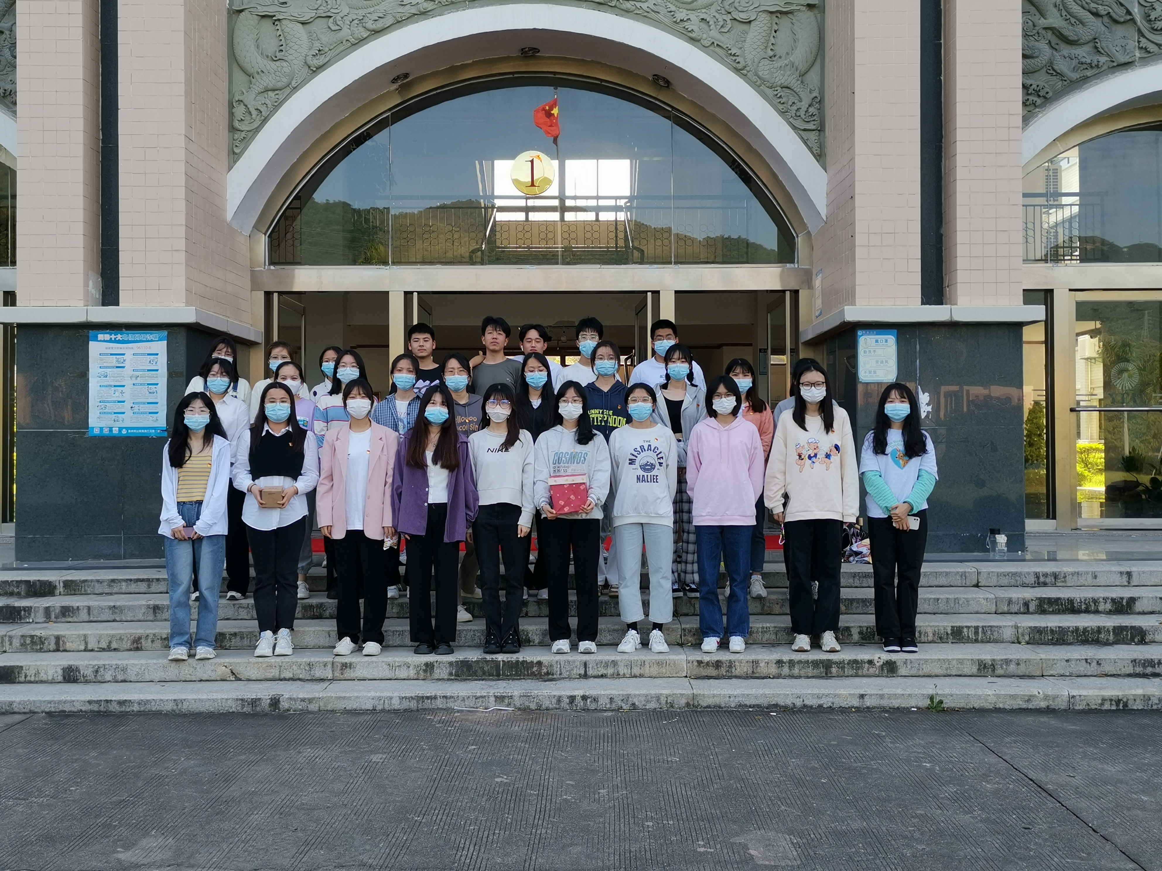 图1 党支部成员正在进行环跑活动 活动开始前,工作人员将各个写着不同垃圾名字的彩色纸片放置于沿途路上,在解说完流程后,带领各个队伍从正门出发绕着仰恩楼慢跑一圈并收集垃圾纸片。跑完后按组别站好,派出代表将本队收集的垃圾纸片进行垃圾分类,工作人员进行计分并对得分最多的队伍给予奖励。最后,老师对本次活动做出总结和评价并宣布此次活动圆满结束。