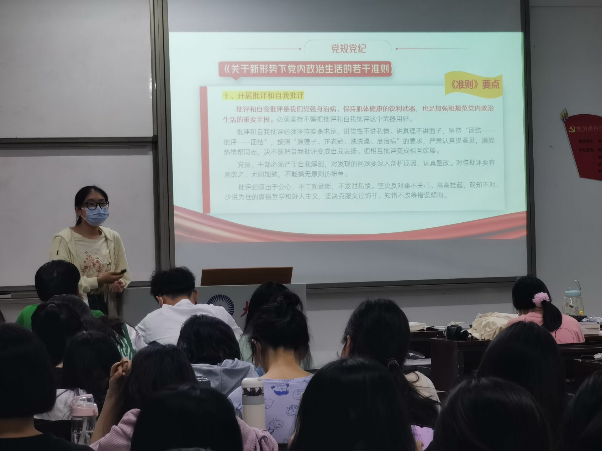 为了让支部全体同志加强党性修养,保持和发扬党的优良传统作风,使廉洁自律规范内化于心、外化于行,坚持理想信念宗旨的“高线”、严守党规党纪“底线”。2022年5月23日下午4点30分,经贸系学生第一党支部在仰恩楼A1-109开展“讲党性,守党规,严党纪”书记好党课。经贸系学生第一党支部书记黄培真老师、全体学生党员,以及入党积极分子参加了此次活动。