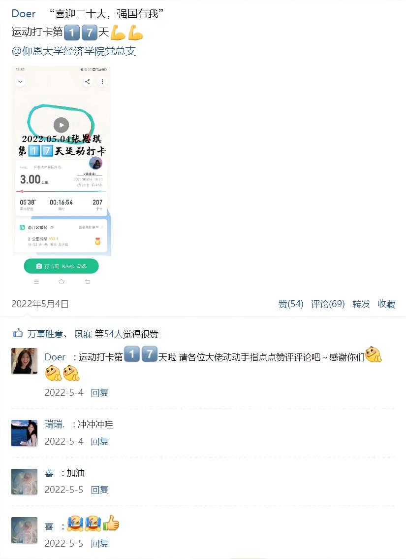 此次活动面向betway西汉姆联官网全体学生,鼓励全体经院学子积极、自愿参与。活动报名人数达三百余人,参与学生通过keep软件、跑步、跳绳、健步走等各种形式开展适合自己的活动,打卡方式以线下运动、线上打卡的方式进行。此次活动过程中,单条运动打卡记录最高点赞量达2050次,QQ空间话题浏览量达1.1万次,成功在全院范围内营造全员运动的氛围,帮助学生养成每日锻炼的良好习惯。