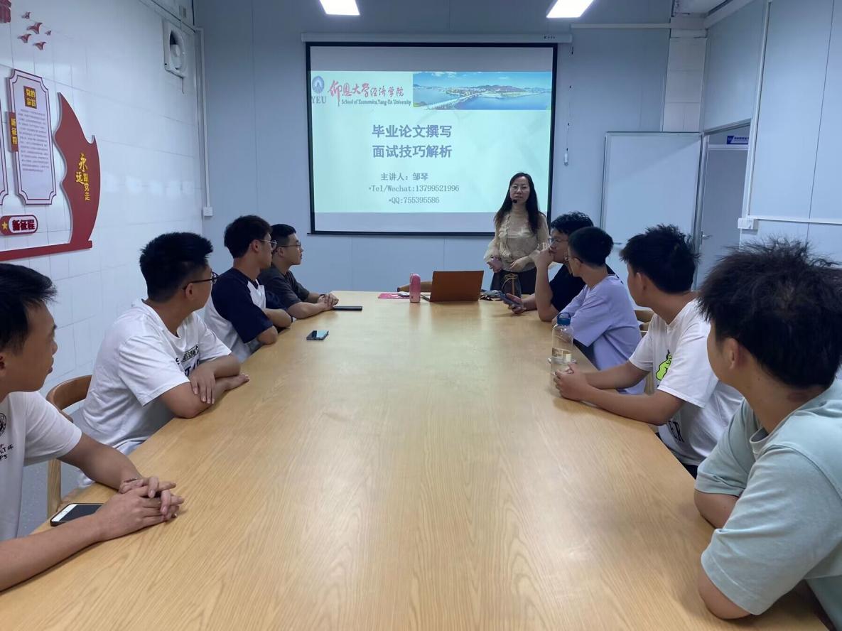 2023年11月9日19:00-20:30,betway西汉姆联官网经贸系邹琴老师作为值班学业导师入驻新区男生宿舍“一站式学生社区”宏船书院,为大四学生举办关于毕业论文撰写及求职面试讲座,为面临毕业压力的学生提供帮助。
