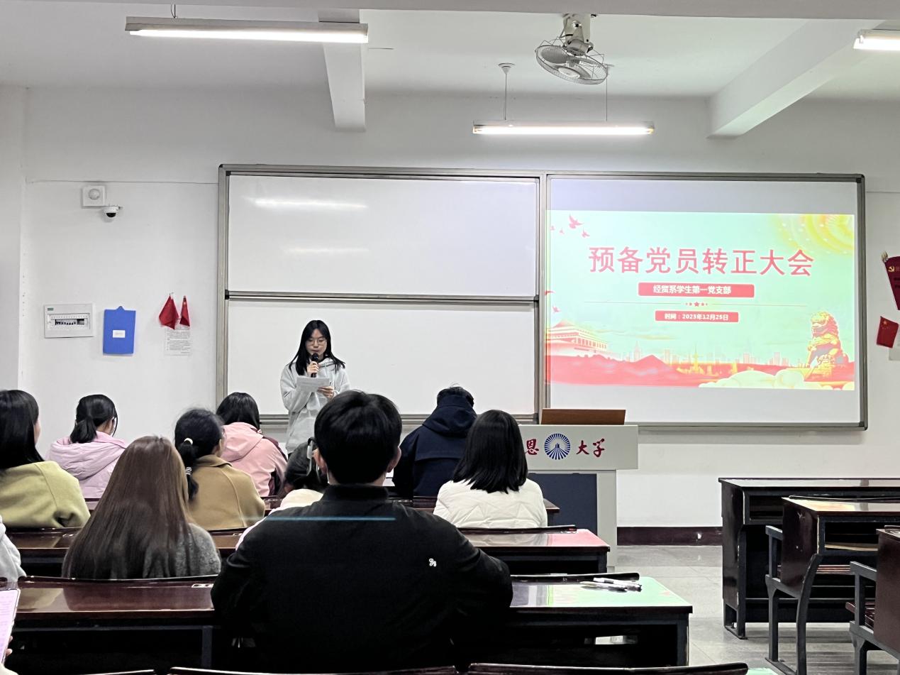 为严格落实发展党员要求,加强基层党组织建设,12月25日晚,经贸系学生第一党支部召开党员大会,讨论表决陈梦菲等三名预备党员的转正事宜。本次党员大会由支部书记黄培真主持,经贸系学生第一党支部全体党员出席会议。