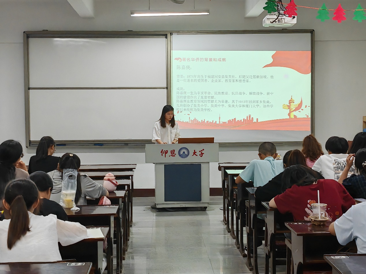 积极分子林丽丽同学介绍了郭永怀、陈嘉庚、吴庆星等老一辈华侨的感人故事,展现了他们作出的卓越贡献,感悟华侨精神。同学们深刻感受到了华侨华人们奋力拼搏、走向世界的艰难创业历程以及对祖国的满腔热爱,见证了华侨华人们自强不息的奋斗精神,心系家国、爱国奉献的精神。