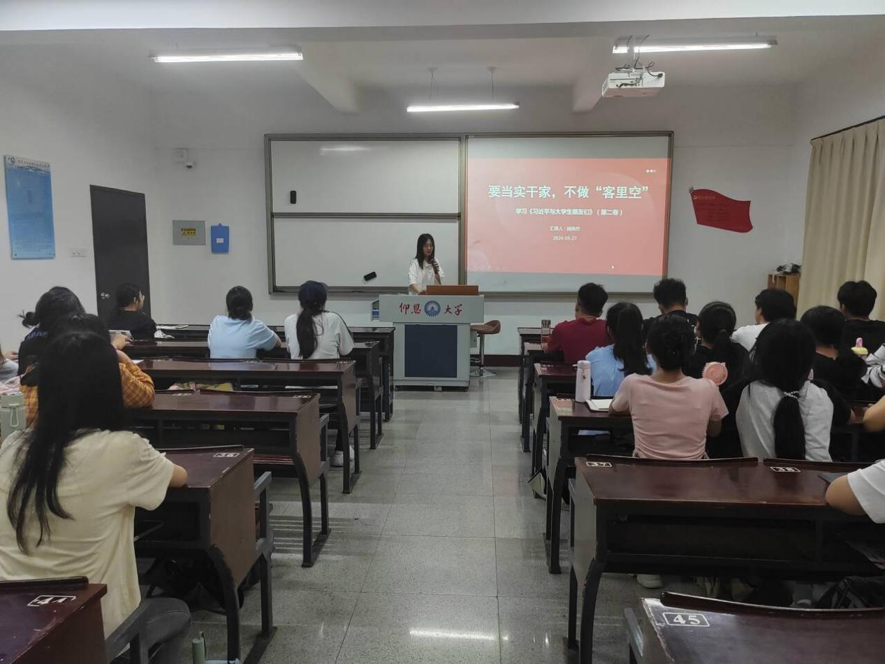 为进一步深刻领会习近平总书记关于青年工作的重要思想的深厚实践根基和炽热情感关怀,促进对习近平总书记关于青年工作的重要思想再领会、再深化,2024年5月27日,betway西汉姆联官网团委书记姚姝然在仰恩楼教室开展了“要当实干家,不做‘客里空’”主题团课,带领同学们共同学习《习近平与大学生朋友们》(第二卷),院、系团学骨干及班级学生骨干参与本次学习。