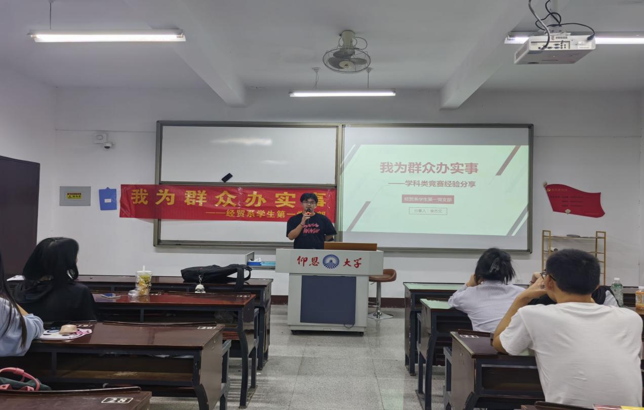 6月3日晚上,经贸系学生第一党支部于仰恩楼A5-105组织开展“我为群众办实事”活动,邀请李杰文和陈梦菲分享学习竞赛经验分享。