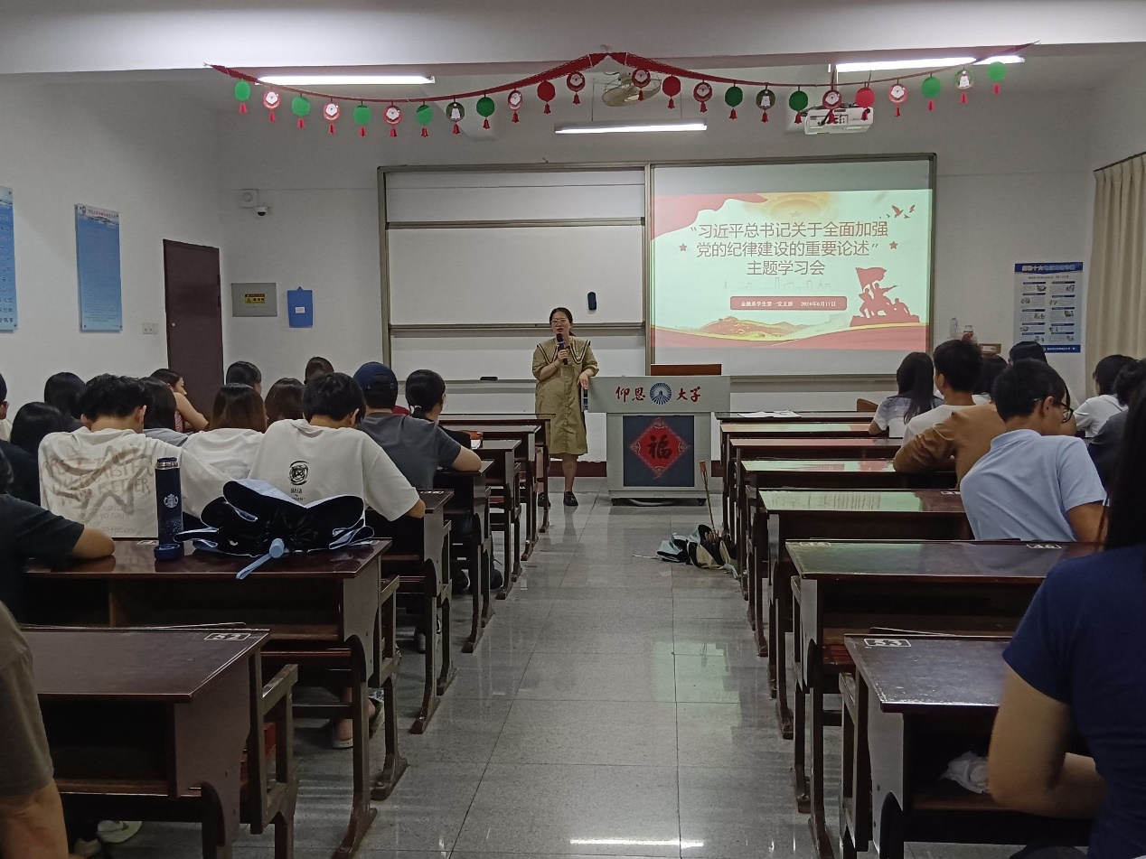 为了深入学习贯彻总书记关于全面加强党的纪律建设的重要论述,深刻把握党风廉政建设规律,2024年6月17日晚上7:30,betway西汉姆联官网金融系学生第一党支部在仰恩楼C2-305组织开展 “习近平总书记关于全面加强党的纪律建设的重要论述”主题学习研讨会。支部书记何丽玲老师、支部全体党员及各班积极分子代表参加了此次学习会。