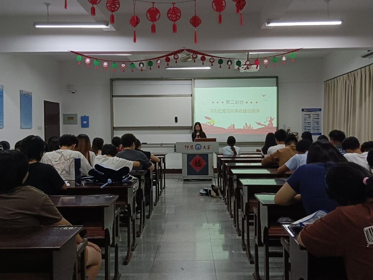 本次学习会主要围绕“什么是纪律规矩”、“为什么要加强纪律建设”、“怎样加强纪律建设”等重大问题展开学习与分享。支部总干事周怡芯同学先阐述了全面加强党的纪律建设的重要论述,强调全体党员和积极分子应当严于律己,提高党性觉悟。接着各班代表围绕党的纪律建设展开深刻探讨和感悟分享,将理论融于实际,从多角度多方面展开论述,做到以身作则,率先垂范。其中积极分子代表郑燕娟同学表示,党员领导干部带头有助于展现党员良好的形象和作风,深刻阐明了领导带头、引领表率的重大意义,以此激励全体党员和积极分子要严守党的政治纪律和组织纪律,做一名合格的中共党员或入党积极分子。
