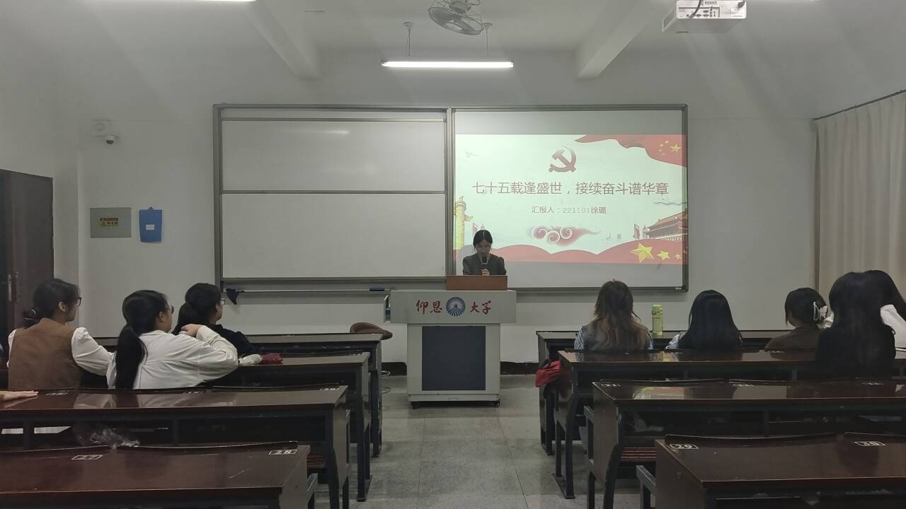 第一位分享人围绕“七十五载逢盛世,接续奋斗谱华章”的主题展开。她首先回顾了新中国成立七十五周年的伟大历程,回顾了中国人民在中国共产党的领导下取得的辉煌成就。随后,她谈到了作为新时代青年党员的责任和使命,鼓励大家要继承和发扬党的优良传统,继续为实现中华民族伟大复兴的中国梦贡献自己的力量。分享中,她提到了当代模范人物的先进事迹,让在场的支部成员深受感动和鼓舞。