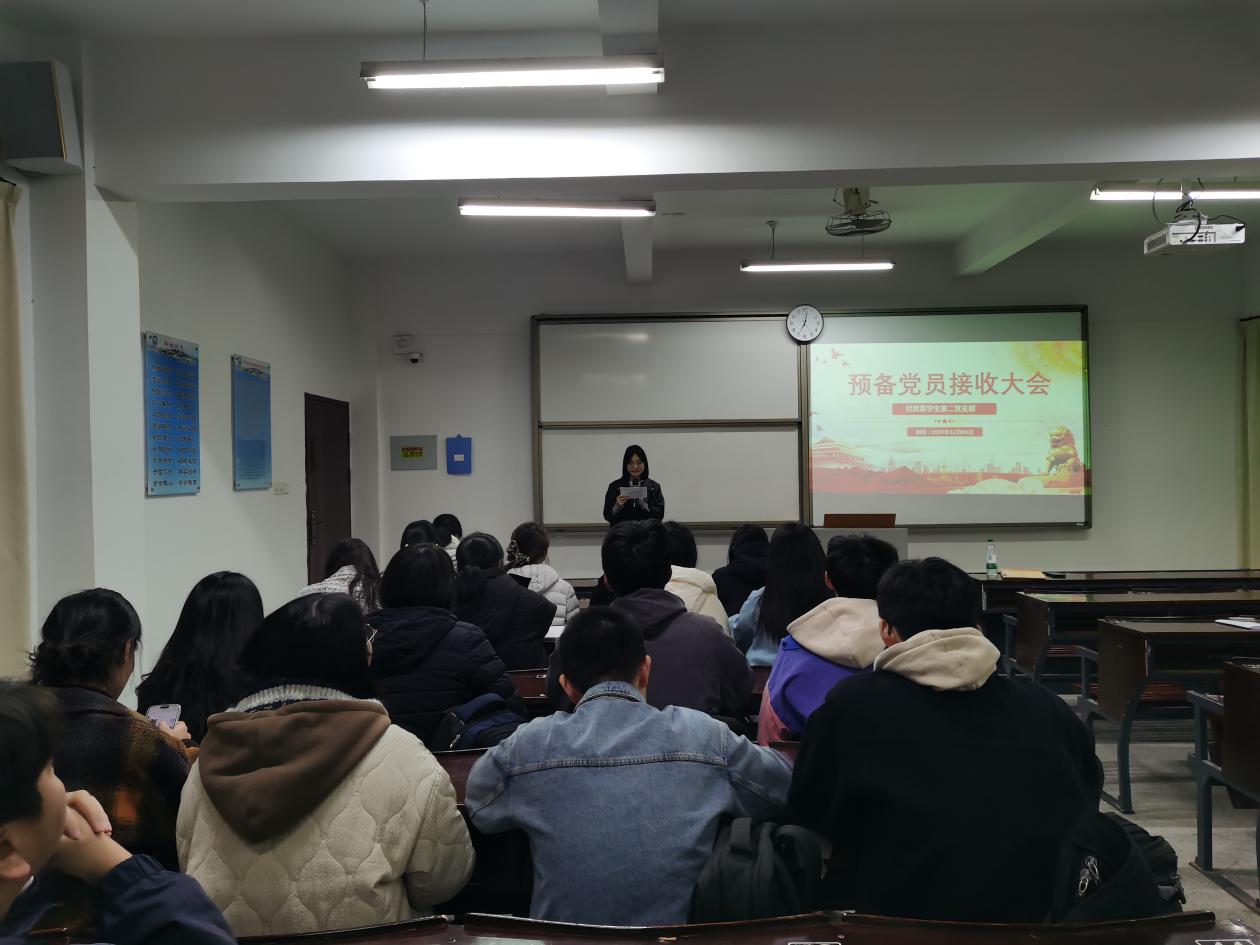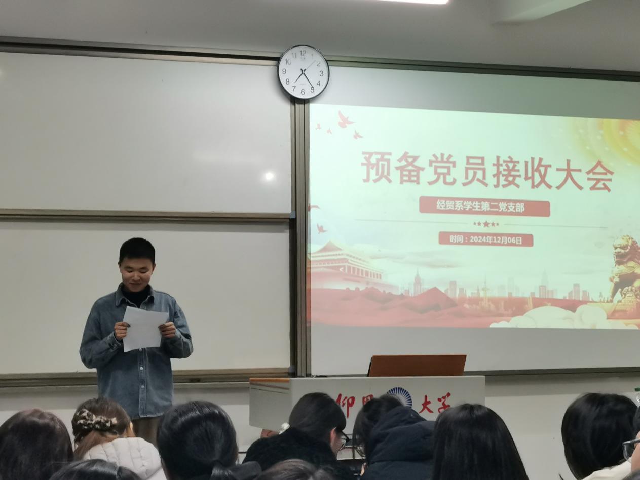 2024年12月06日晚19:00在仰恩楼A1-109,betway西汉姆联官网经贸系学生第二党支部召开预备党员接收大会,主要讨论吸收新党员。支部书记李荣美等支部全体15名党员参加了此次接收大会。