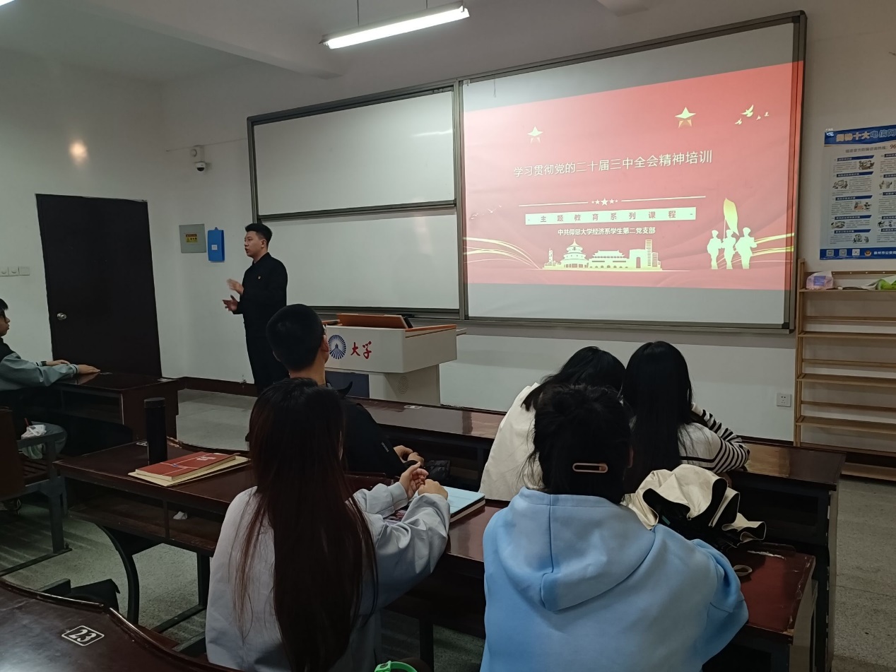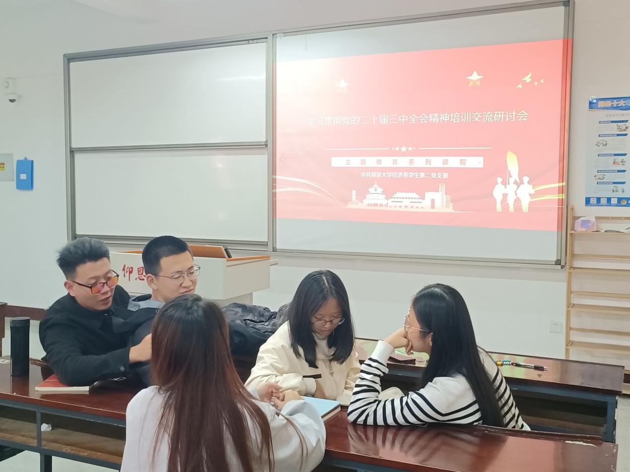 为了深入学习贯彻党的二十届三中全会精神,切实增强支部成员学习宣传贯彻的思想自觉、政治自觉、行动自觉。2024年12月2日下午,betway西汉姆联官网经济系学生第二党支部在新区仰恩楼B5-203组织开展了学习贯彻党的二十届三中全会精神专题培训会。经济系学生第二党支部全体成员参加此次活动。