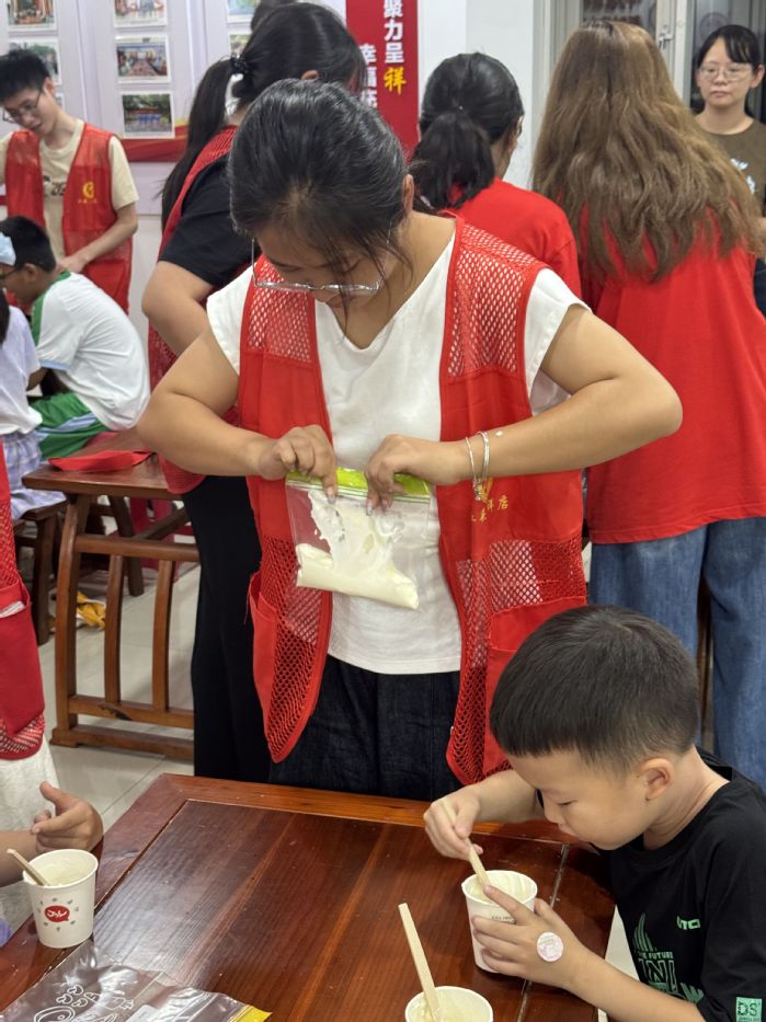 小朋友们分组协作,一边对照英文步骤操作,一边互相纠正发音,欢声笑语不断。队员们分组下达每个小组的制作活动中,协助小朋友们亲手制作冰淇淋,在活动过程中,每个小组都取得了不错的成果,也在炎炎夏日品尝到亲手制作的冰淇淋,小朋友们开心不已,队员们也获得了小朋友的一致认可,在成就感中不知不觉锻炼了口语表达。